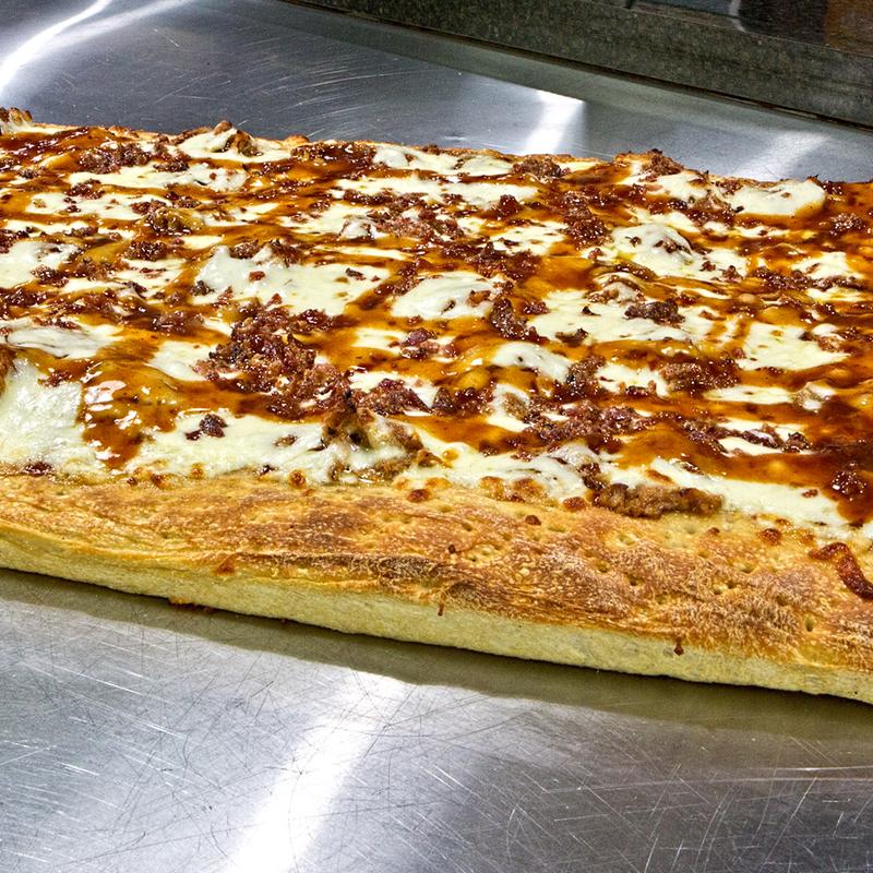 A Rectangle 1 inch Pizza with more fresh made dough, more home-made sauce, more fresh cut Mozzarella Cheese and your choice of more fresh and locally grown veggies and meat toppings to make a perfect pizza every time!