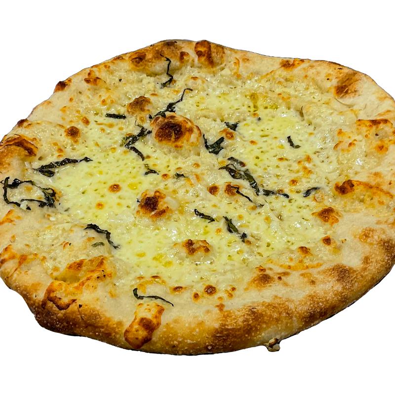 Fresh Californian White Garlic, Fresh Dough, Extra-Virgin Olive Oil, Basil, Mozzarella & Pecorino Romano Cheese