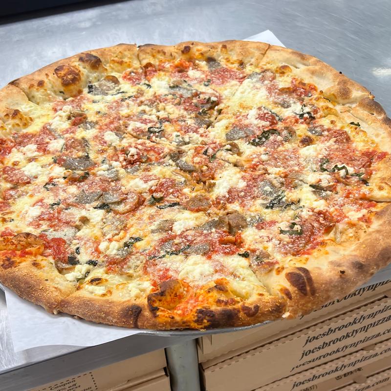 Fresh Dough, Tomato Sauce, Pepperoni, Sausage, Extra-Virgin Olive Oil, Sweet Peppers, Garlic, Shallot, Basil, Mozzarella & Pecorino Romano Cheese